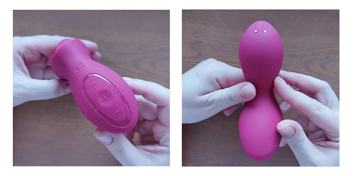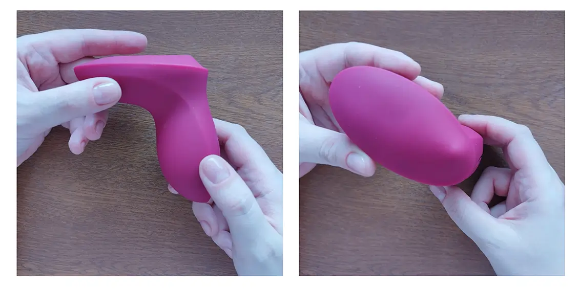 Это компактная унисекс-игрушка для стимуляции внешних эрогенных зон. Выглядит максимально нейтрально: небольшая ручка с кнопками, расположенными на внешней стороне, и овальная площадка, на которой под слоем силикона находится шарик. Шарик двигается вперёд и назад, имитируя прикосновения подушечкой пальца, а сама площадка ещё и вибрирует.