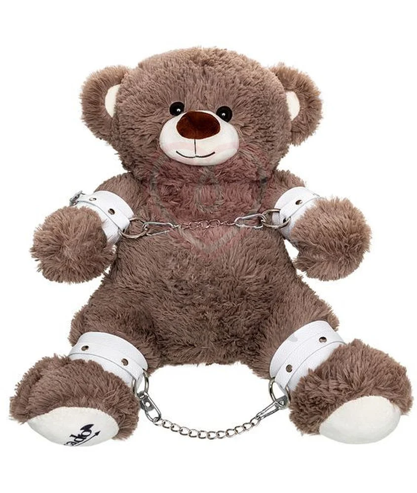 Бандажный набор Медведь бурый Pecado BDSM - это оригинальный комплект, состоящий из большого игрушечного медведя, на лапы которого надеты ножные оковы и наручники. Набивка медведя - холлофайбер, ровные швы. Наручники и наножники выполнены из качественной натуральной кожи, представленной в минималистичном белом цвете. И наручники и оковы дополнены удобными пряжками, с помощью которых можно регулировать их размер, поэтому аксессуары будут впору на большинство размеров запястий и щиколоток.