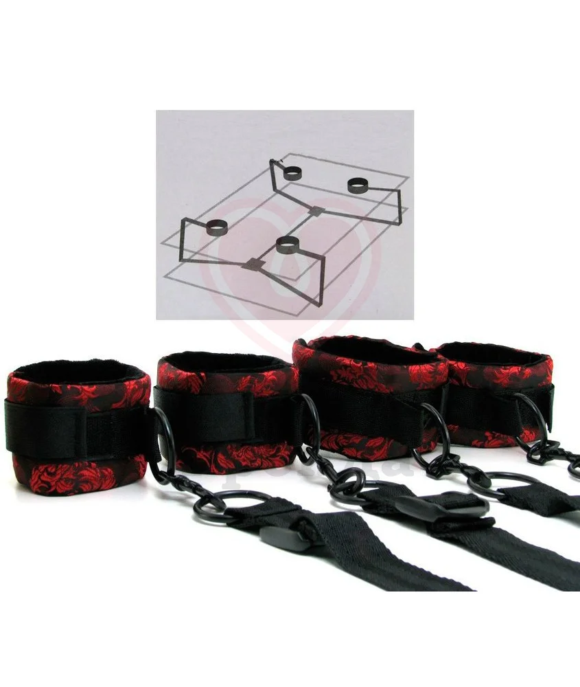 Внутри оковы отделаны приятным материалом, который не трет ручки и ножки вашего любимого, не провоцирует никакого раздражения. Внешний дизайнерский рисунок сделает игры стильными и эстетически красивыми. В комплект входят 4 регулируемых ремня с металлическими кольцами и карабинами для привязывания к кровати, а также же один ремень для полной фиксации всей конструкции с обратной стороны кровати или матраса. Длина каждого ремня 144 см поэтому комплект отлично подойдет для кровати любого размера.