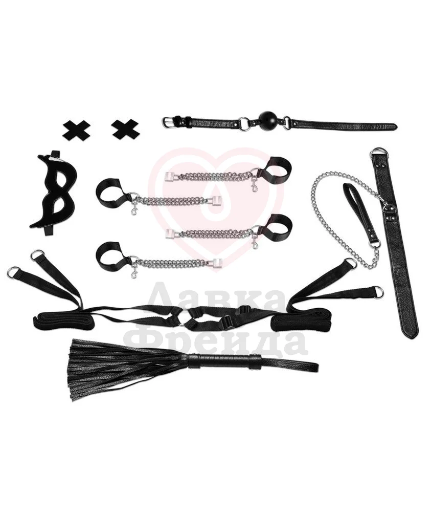 Этот набор предоставит вам возможность попробовать разнообразные БДСМ-практики: в комплект входят 6 предметов от девайсов для активных взаимодействий до аксессуаров, чтобы создать подходящий для особенного вечера образ.