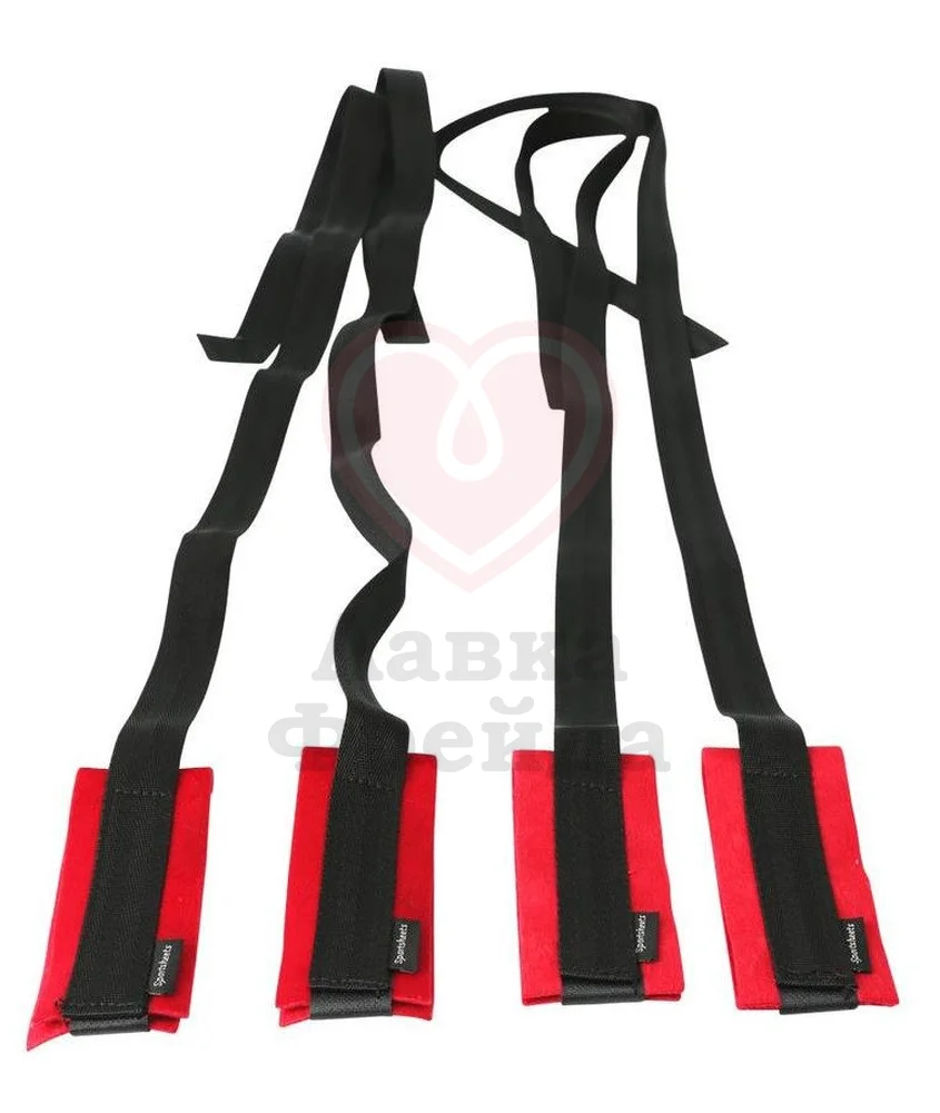 Комплект оков для ног и рук с креплением для кровати. Эластичные ленты длиной 112 см располагаются под матрас, чтобы наручники и оковы находились сверху постели. Сковывайте вашего партнёра, чтобы он полностью оказался в вашей власти! Оковы регулируются при помощи липучек.