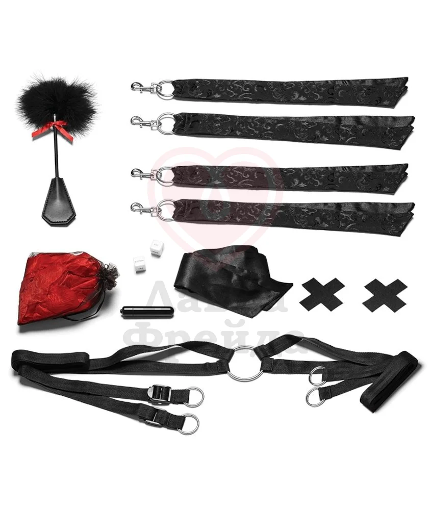 - Сатиновые крепления для фиксации в кровати располагаются под матрасом и помогают обездвижить партнёра в постели при помощи шелковистых бантов. Ленты мягко завязываются на лодыжках и запястьях.