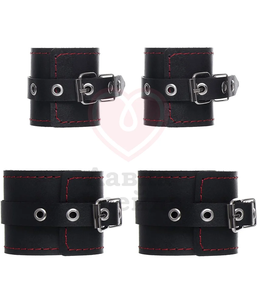 Размер наручников и наножников регулируется удобными пряжками, поэтому они комфортно сядут на запястья и щиколотки почти любого размера. Набор выполнен из качественной натуральной кожи, достаточно мягкой, чтобы не натирать и не доставлять неудобства во время любовной игры.