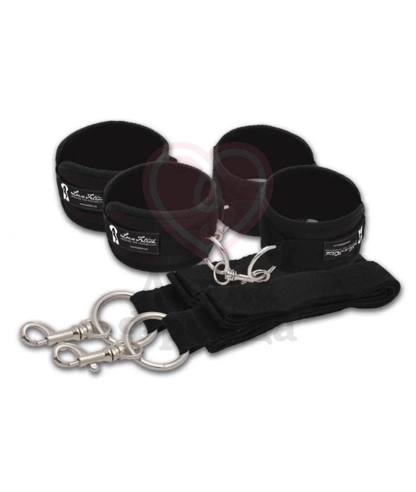 Набор фиксирующих элементов представляет собой 5 частей, которые соединяются таким образом, чтобы сверху кровати оказались удобные оковы и наручники для обездвиживания вашего партнёра. Крепления выполнены из текстиля черного цвета с соединительными частями из металла — колечки и карабины.