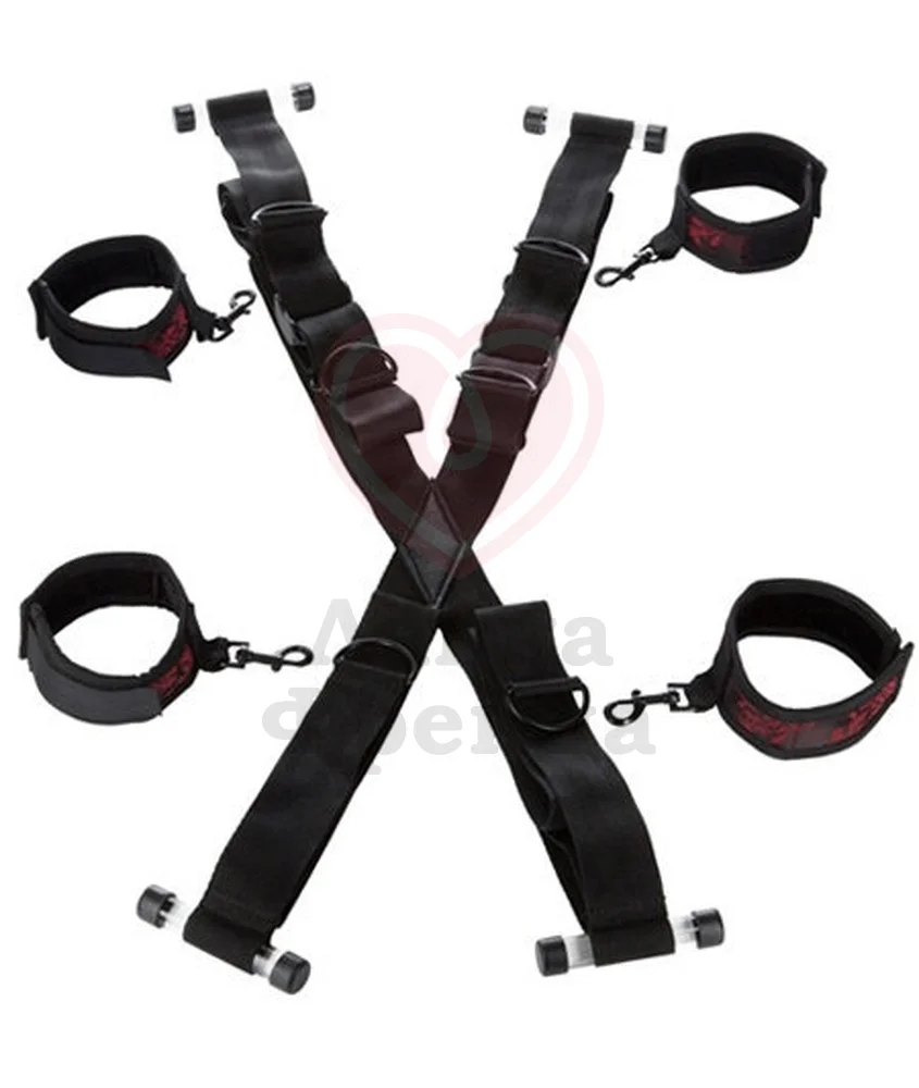 Фиксация на дверь Scandal Over The Door Cross выполнена из мягкого чёрного полиэстера, декорированного красным дизайнерским узором. Манжеты изнутри покрыты бархатистым материалом, обеспечивающим длительный комфорт во время игры. Оковы регулируются до 36,8 см с помощью застёжек-липучек. Перекиньте пластиковые цилиндры так, чтобы они зафиксировались дверью. Вы можете настраивать длину крестообразных ремней в зависимости от высоты проёма. Зафиксируйте лодыжки и запястья партнёра с помощью оков. Карабины позволяют за пару секунд изменить положение тела, если вы захотите насладиться видом сзади.