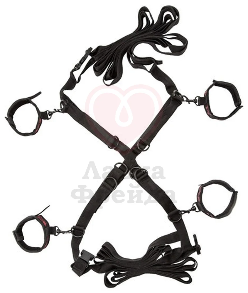 Фиксаторы на кровать Scandal Over The Bed Cross выполнены из мягкого чёрного полиэстера и украшены красным дизайнерским рисунком. Манжеты и оковы регулируются до 36,8 см. Ремни для кровати регулируются до размера 456 см. Манжеты легко фиксируются на ногах и руках. Внутренняя часть покрыта бархатным материалом, обеспечивающим дополнительный комфорт. Ремни следует продеть под кроватью для фиксации партнёра в крестообразном положении. Такая игра максимально сближает и раскрепощает влюблённых. Прочные ремни полностью регулируются и подходят для кровати любого размера. Карабины и кольца имеют поворотную конструкцию, благодаря чему смена положения занимает считанные секунды.