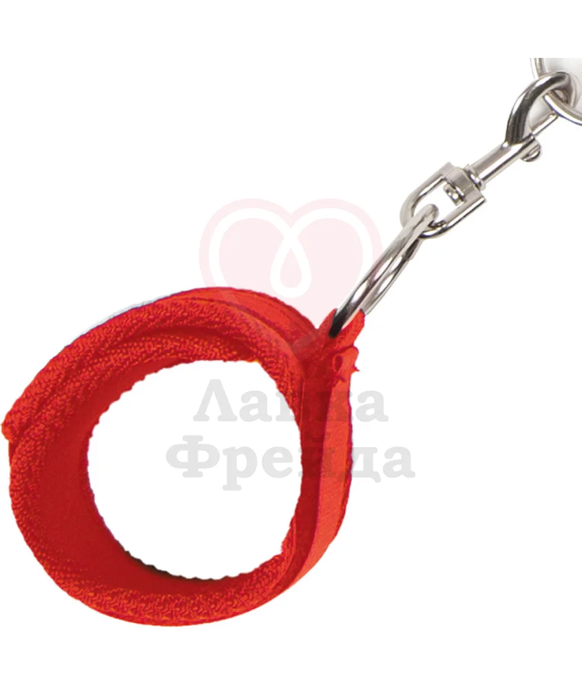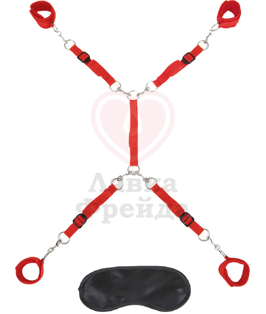 Набор фиксирующих элементов представляет собой 5 частей, которые соединяются таким образом, чтобы сверху кровати оказались удобные оковы и наручники для обездвиживания вашего партнёра. Крепления выполнены из текстиля красного цвета с соединительными частями из металла — колечки и карабины.