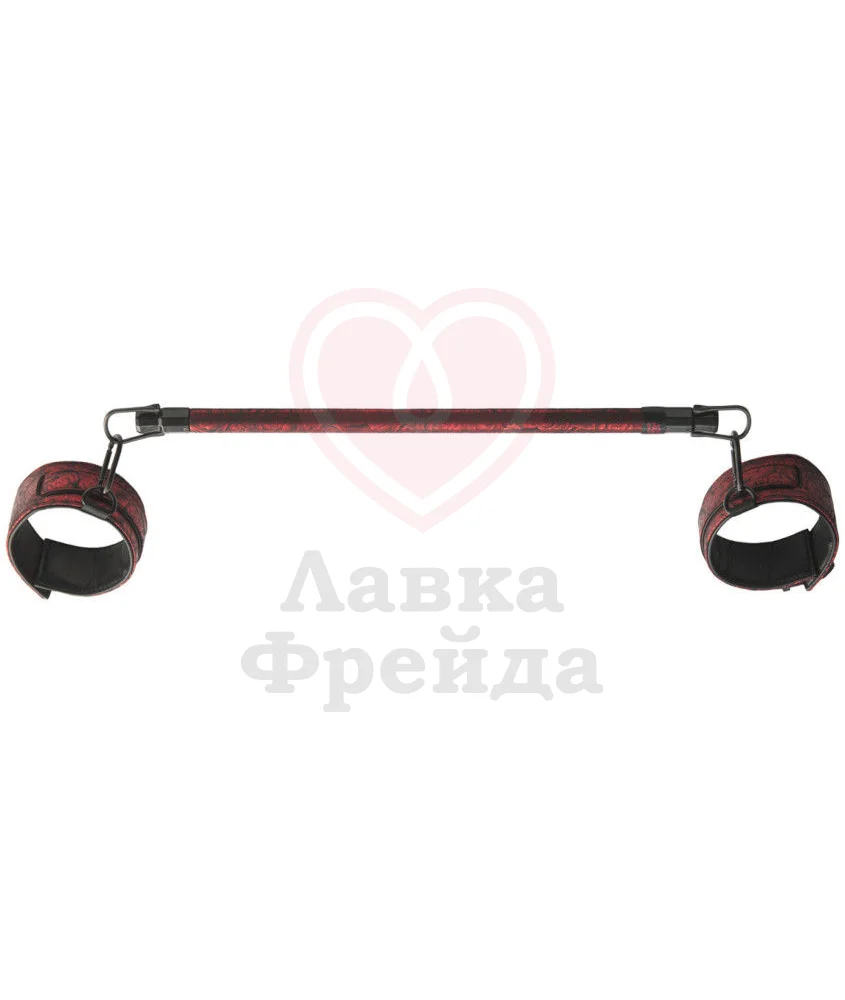 Длина балки распорки 44,5 см, диаметр 1,8 см. Оковы закрепляются к распорке при помощи D-колечек и круглых карабинов, чтобы при желании их всегда можно было снять. Двухсторонний дизайн материала позволяет использовать любую из сторон — с черной искусственной кожей или рисунком из красных роз.