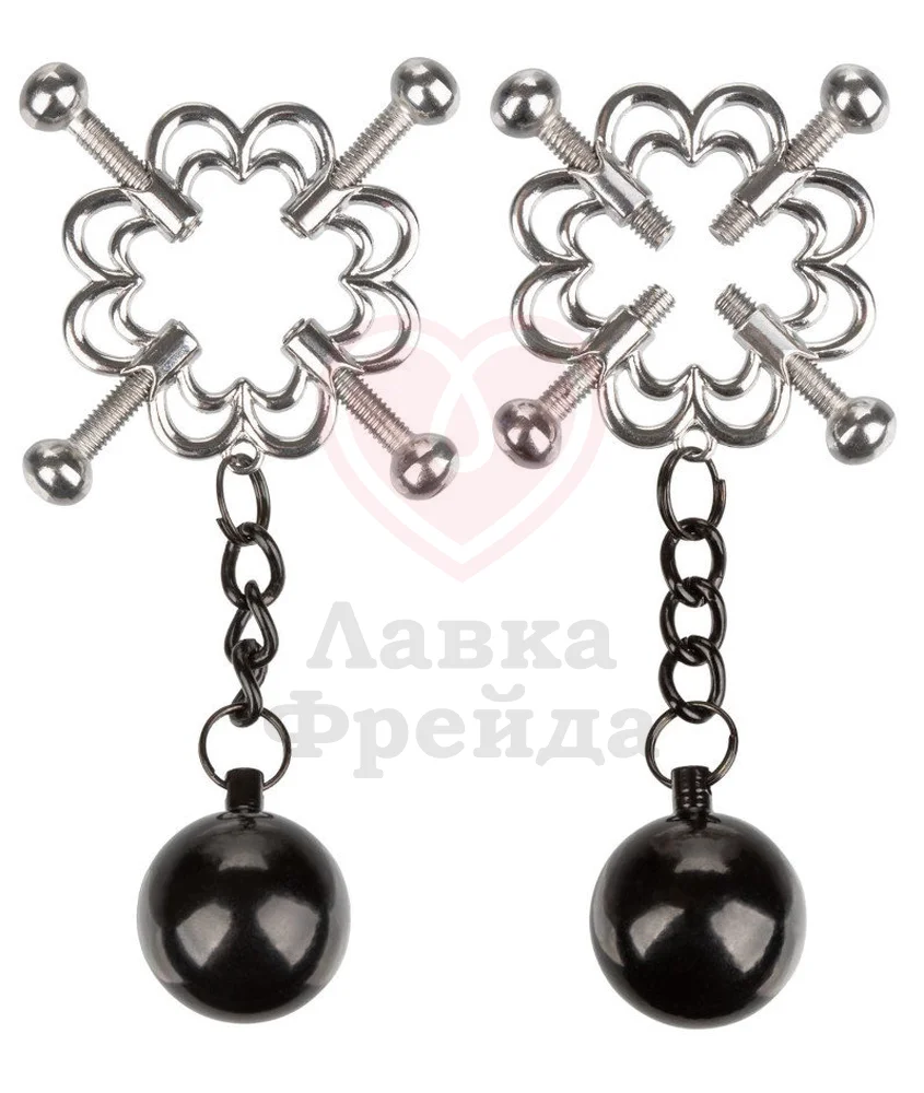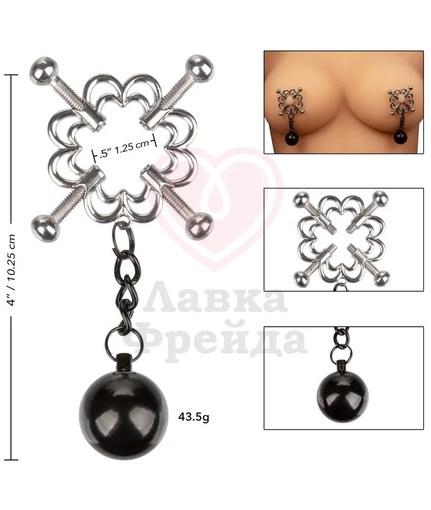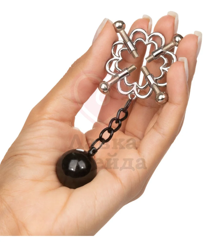 Металлические зажимы Nipple Grips имеют красивый ажурный дизайн в виде цветов и дополнительные грузики весом 43,5 г. Игрушка закрепляется на груди при помощи регулируемых перекладин, которые закручиваются для наиболее сильного воздействия. Зажимы выполнены из безопасного металла без примесей никеля, который не тускнеет со временем и обеспечивает длительную службу. Чтобы сохранить игрушку в чистоте промывайте её с водой и мылом или специальными средствами.