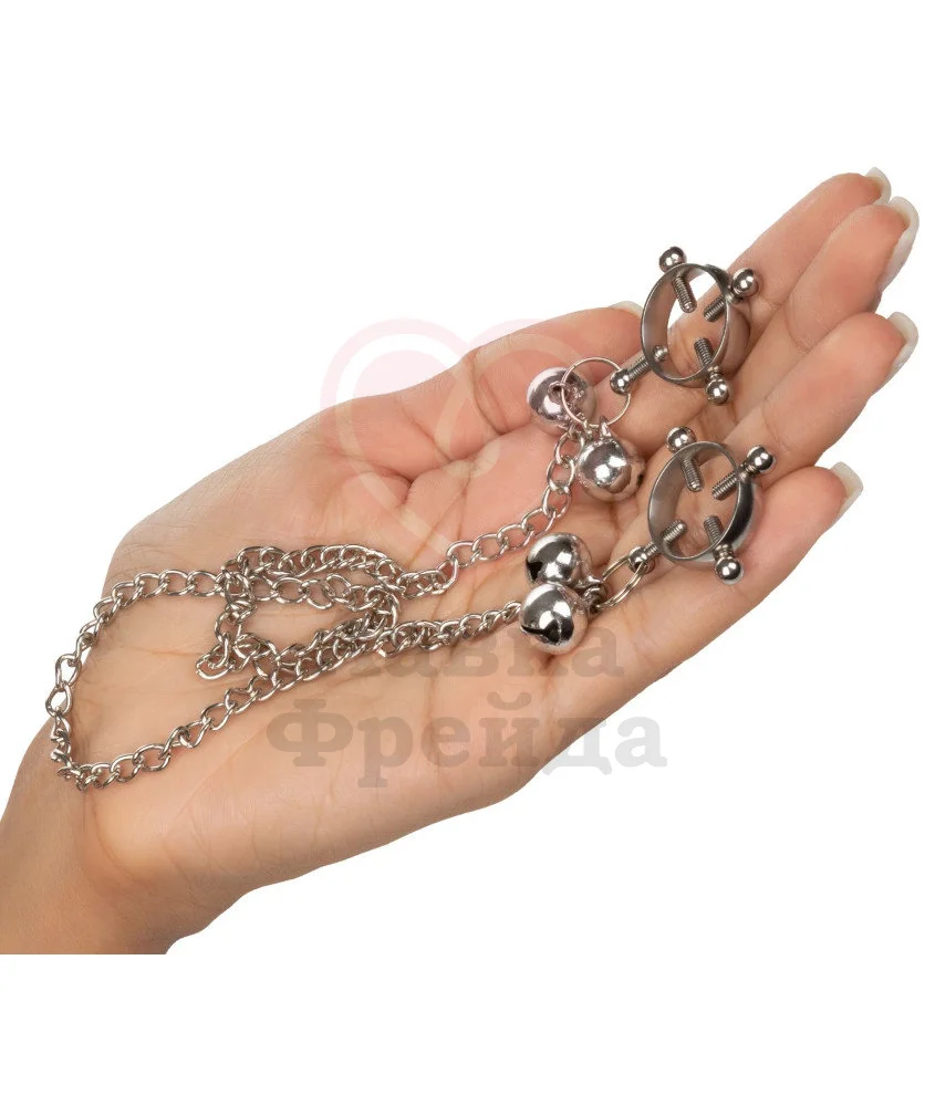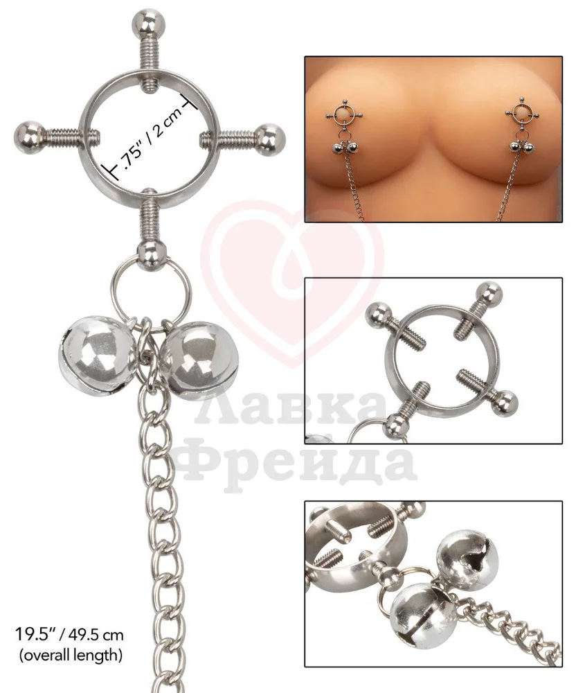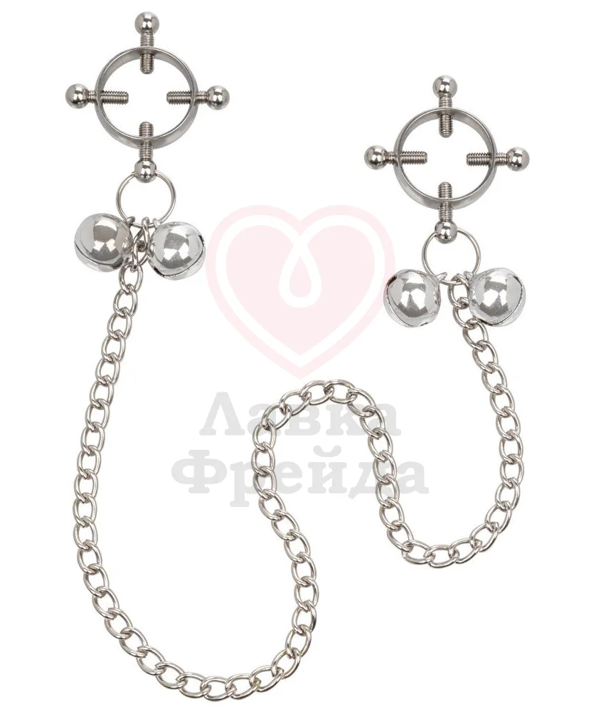 Металлические зажимы имеют особую круглую форму с подвижными перекладинами для особенно сильного воздействия и надежного закрепления. Снизу они соединены цепочкой, которая также является грузом для дополнительной стимуляции. Зажимы украшены маленькими колокольчиками, которые будут издавать звук при движениях. Зажимы выполнены из безопасного металла без примесей никеля, который не тускнеет со временем и обеспечивает длительную службу. Чтобы сохранить игрушку в чистоте промывайте её с водой и мылом или специальными средствами.