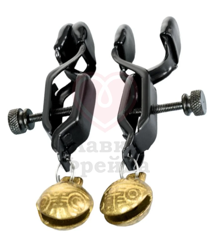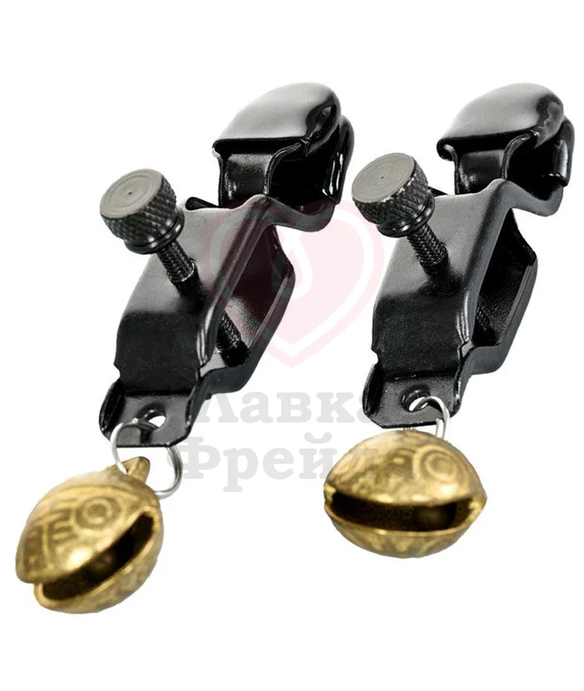 Два зажима для сосков выполнены из металла, сила воздействия регулируются поворотом болтиков. К каждой из частей закреплен маленький колокольчик, который будет слегка звенеть при движении и взаимодействии. Интересный аксессуар для активной ролевой игры.