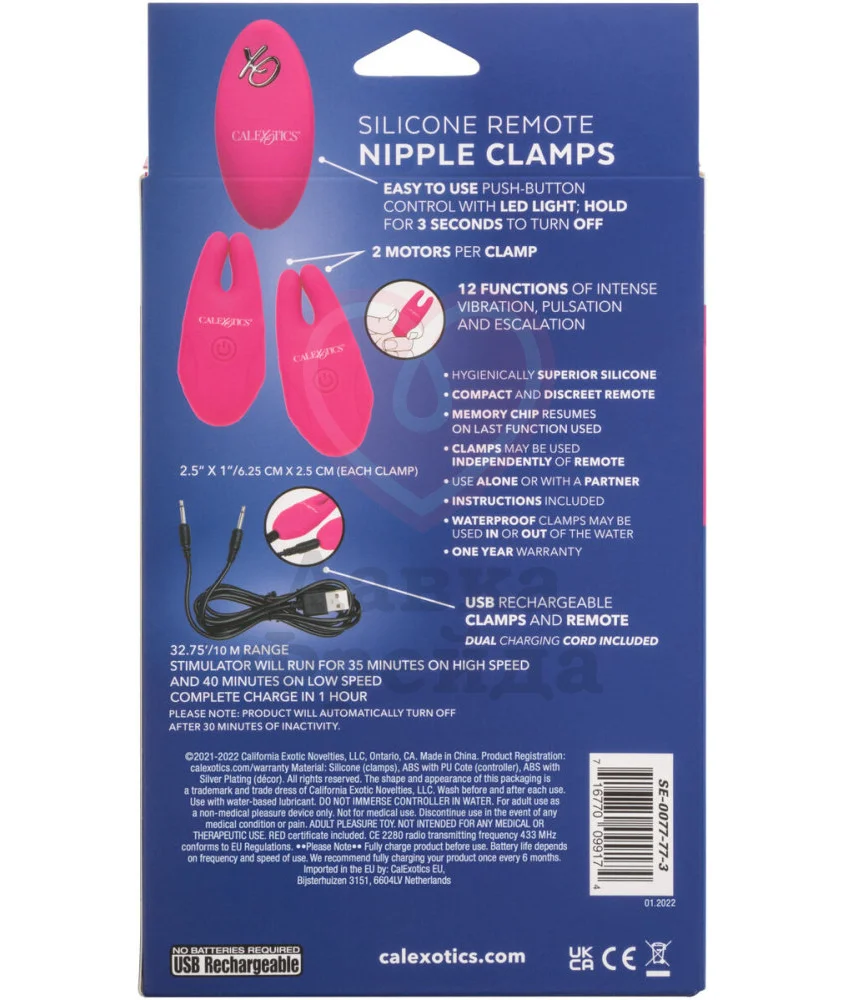 Игрушка перезаряжается через USB кабель - 1 час полной зарядки даст около 40 минут интенсивной стимуляции сосков. Дополнительно можно приобрести браслет Wristband Remote Accessory, с помощью которого можно управлять любыми игрушками из серии CalExotics XO Collection.