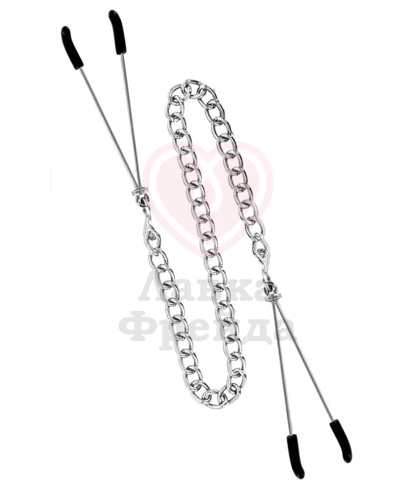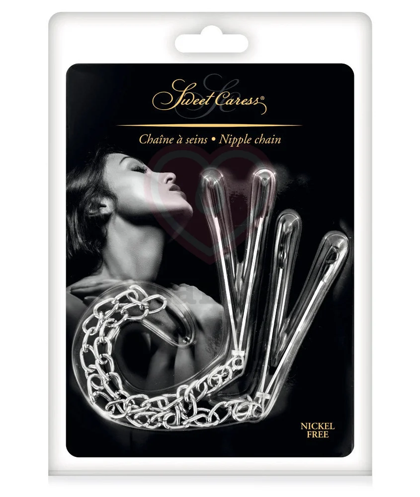Металлические зажимы с мягкими кончиками Sweet Caress регулируются при помощи небольшого колечка, чтобы вы сами выбирали степень воздействия на соски — свои или партнера. Такая стимуляция может стать интересным дополнением в привычный секс или ролевую игру. Между собой зажимы соединены небольшой цепочкой длиной 28,8 см.