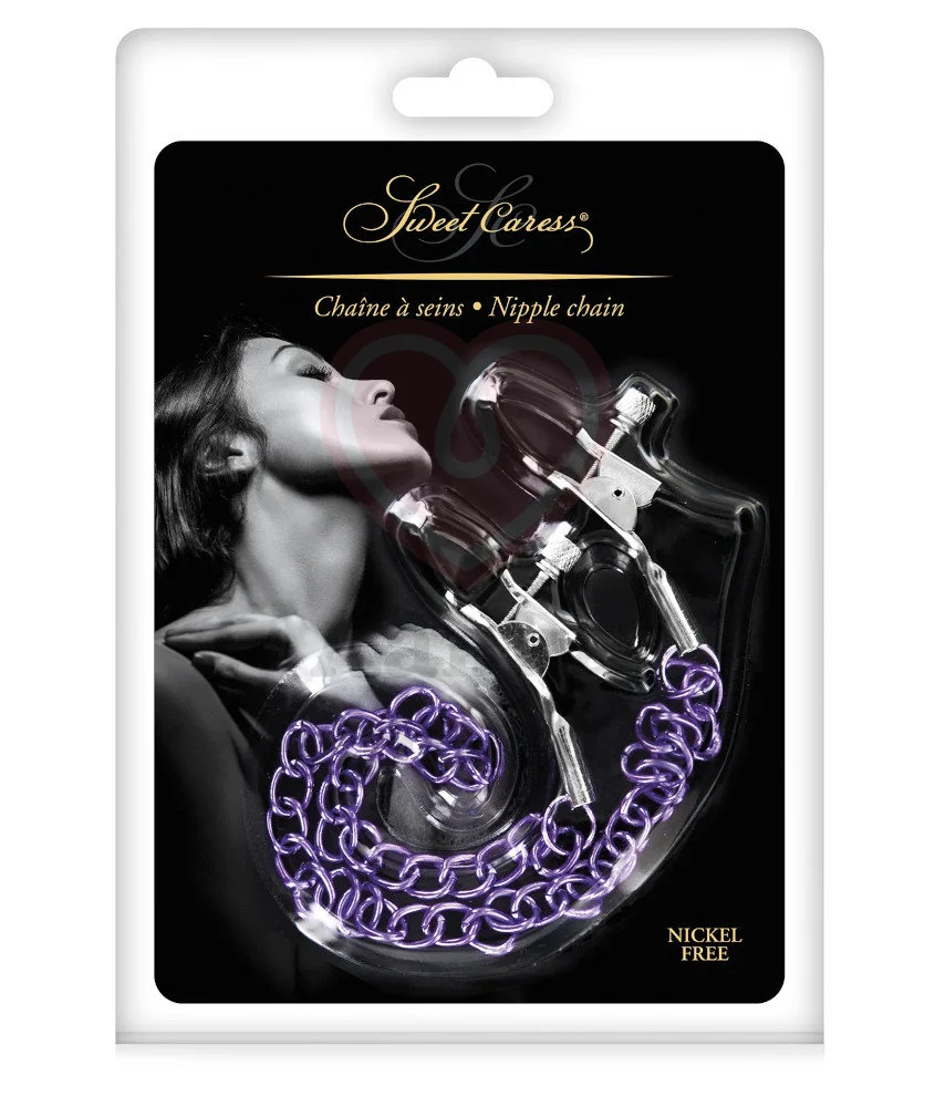 Зажимы для сосков Sweet Caress с цепочкой подойдут для активной стимуляции груди и БДСМ-игр. Игрушка выполнена из металла, дополненного мягким защитным материалом, чтобы ощущения были яркими, но комфортными. Силу сжатия сосков можно регулировать, а цепочка не только является дополнительным украшением, но и может быть задействована в вашей игре. Длина цепочки около 33 см.