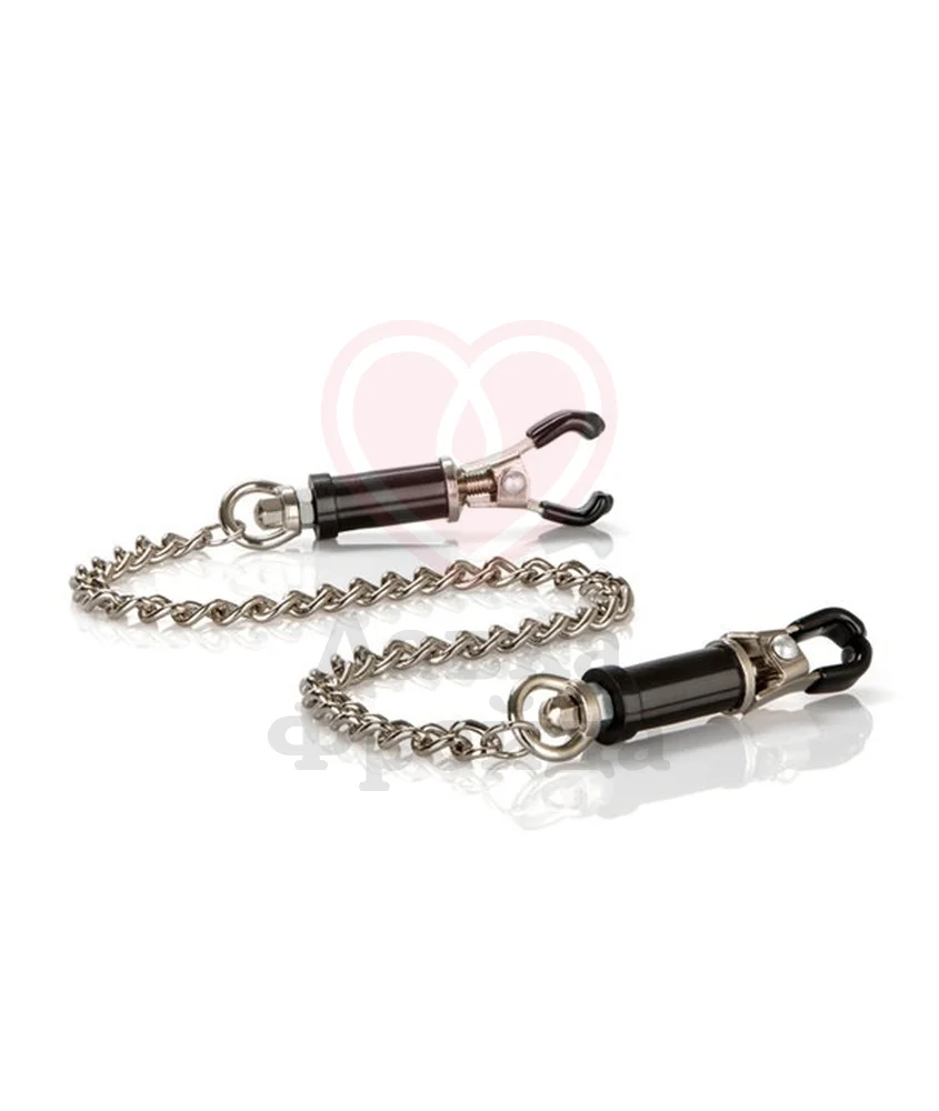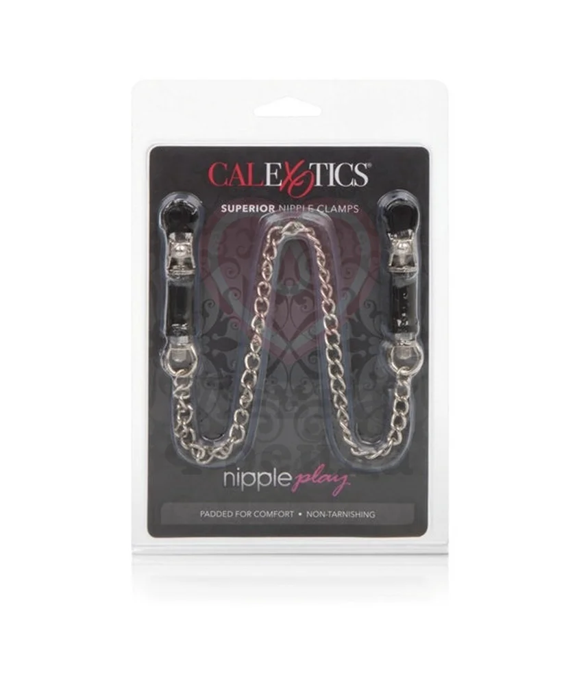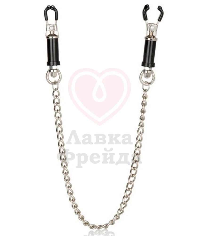 Зажимы на соски Nipple Play Superior Nipple Clamps выполнены из металла и дополнены подушечками из мягкого поливинилхлорида для комфортного использования. Длина зажима – 6,3 см. Диаметр – 1,2 см. Общая длина – 49 см. Вы можете регулировать степень сжатия сосков с помощью регулировочных винтов. Металлическая цепочка играет роль утяжелителя, делая стимуляцию ещё интенсивнее. Игрушка может использоваться как часть БДСМ-наряда.