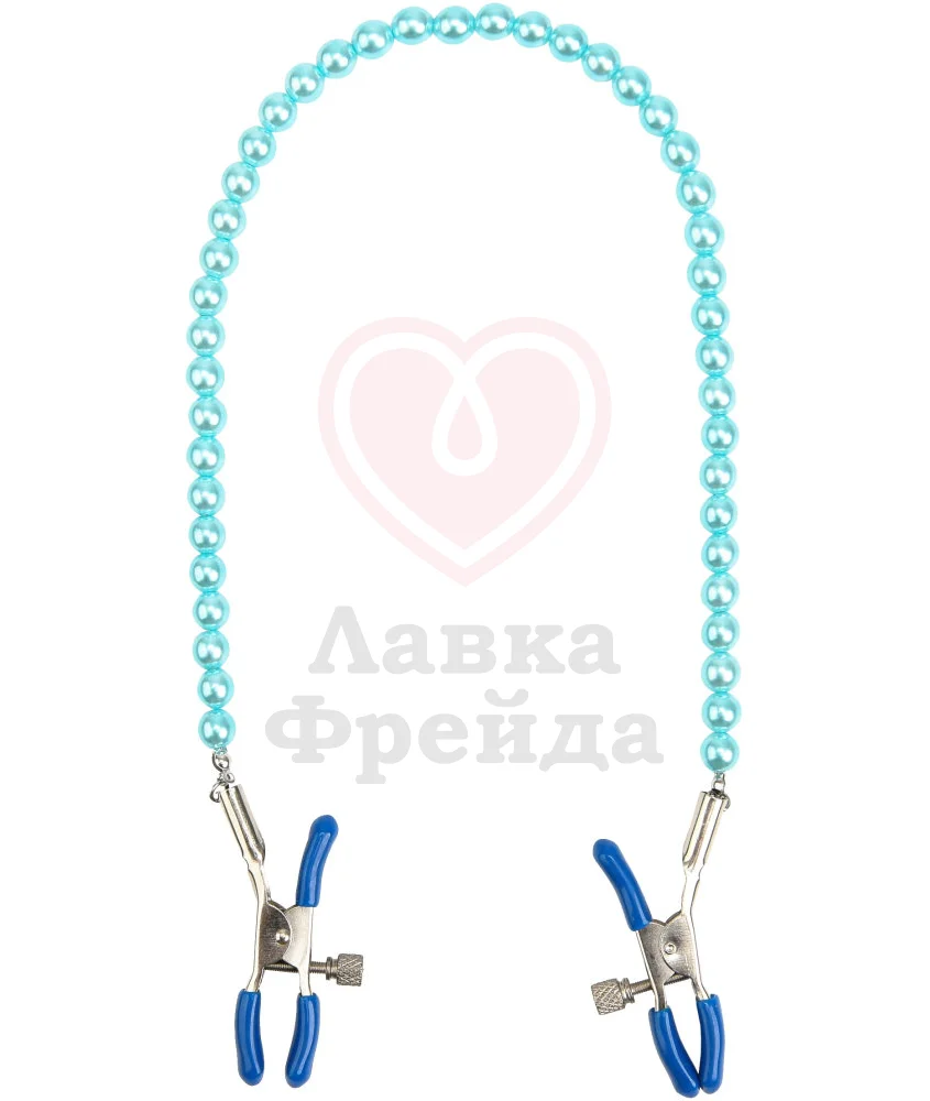 Несъемная цепочка одновременно выполняет роль украшения и утяжелителя, который добавляет приятных и необычных ощущений во время близости. Силу сжатия сосков можно регулировать с помощью удобных закруток по бокам. Аксессуар представлен в ярких голубых и синих оттенках. Изготовлено из прочного никеля высшего качества.
