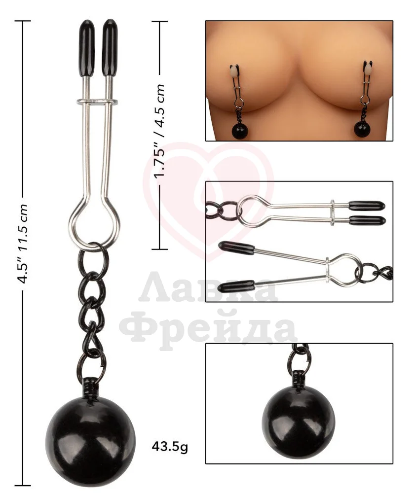 Классические зажимы-прищепки для сосков выполнены из металла и имеют грузики весом 43,5 грамма для дополнительной стимуляции. Сила воздействия игрушки регулируется при помощи подвижного колечка, а смягченные кончики будут комфортно сжимать соски. Зажимы выполнены из безопасного металла без примесей никеля, который не тускнеет со временем и обеспечивает длительную службу. Чтобы сохранить игрушку в чистоте промывайте её с водой и мылом или специальными средствами.