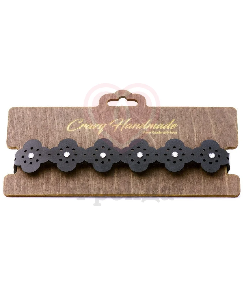 Кожаная лента шириной 3 см имеет узор, напоминающий цветы, в сердцевинах которых сверкают стразы. Очень романтичный и игривый образ можно дополнить такой вещицей. Ремешок регулируется при помощи 4 отверстий. Аксессуар предоставляется на фирменной деревянной планшетке с подвесом.