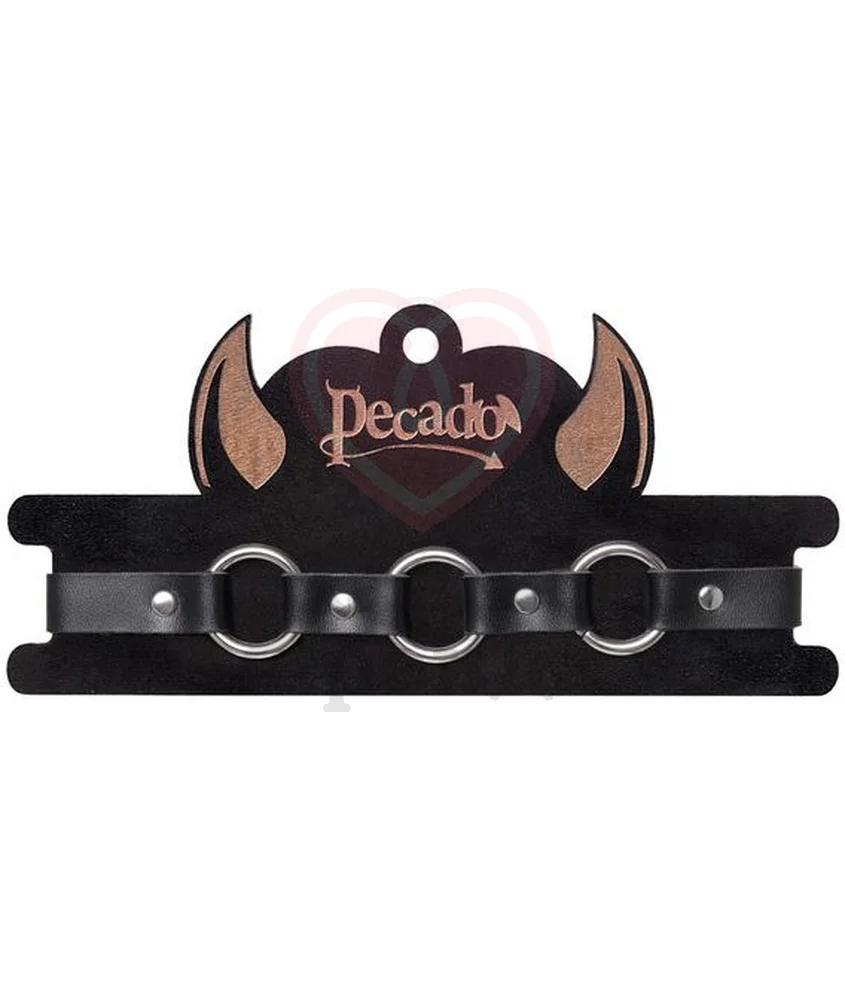 Изящный ошейник-чокер Pecado BDSM сшит из высококачественной натуральной кожи - плотной, устойчивой к износу, достаточно мягкой, чтобы не доставлять дискомфорта во время носки. Модель также дополнена металлическими заклепками и крупными кольцами, к которым при желании можно цеплять различные элементы БДСМ атрибутики с карабинами, например поводок. Размер регулируется удобной пряжкой и ремешком с 4 отверстиями.