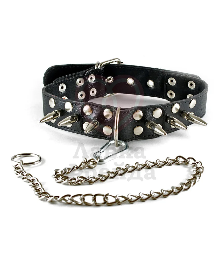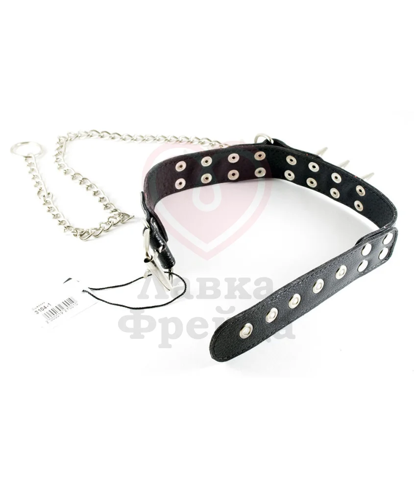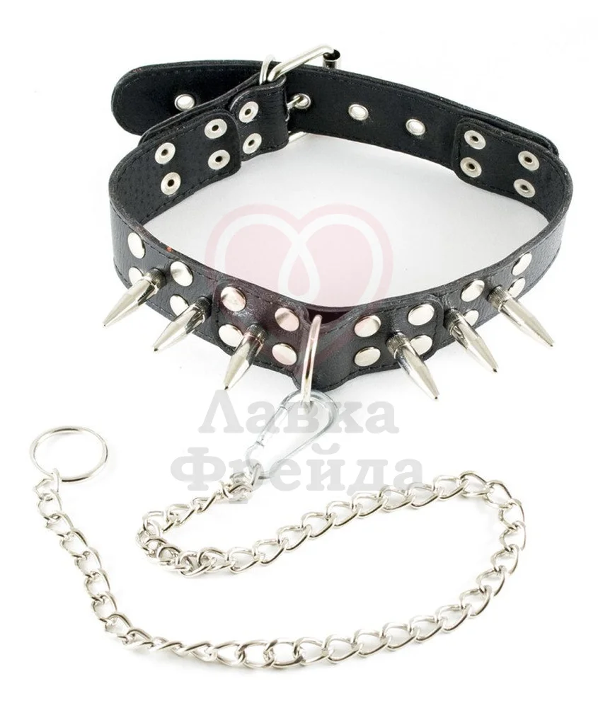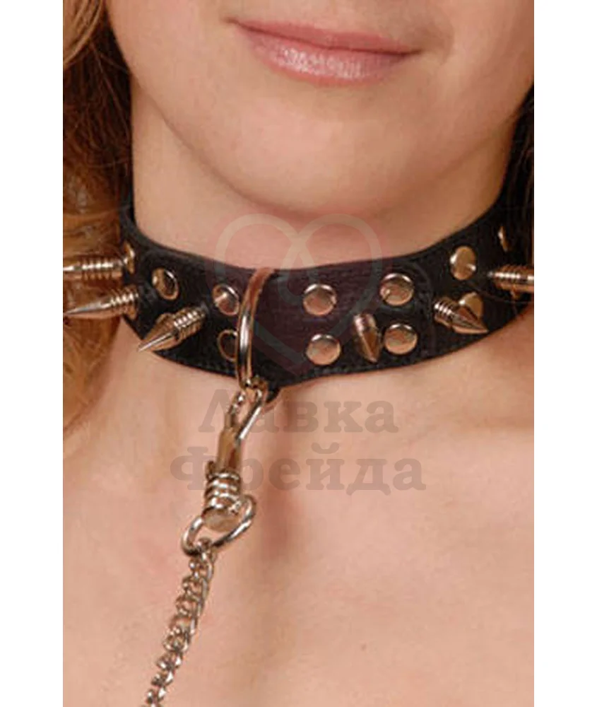 Кожаный ошейник с металлическими шипами Sitabella будет прекрасно смотреться на шее. Поводок длиной 45 см позволит контролировать действия партнера. Цепочка крепится карабином на D-образное колечко и при желании ее можно снять.