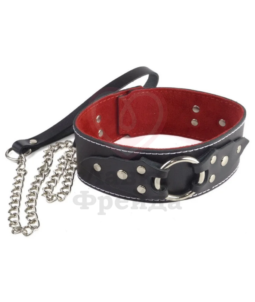 Ошейник длиной 45 см и шириной 5 см — это внушительный и стильный аксессуар, выполненный из натуральной кожи: гладкая чёрная снаружи, а внутри подкладка из более мягкого красного варианта. Ошейник имеет дополнительную белую строчку по краю изделия, придавая чёрному цвету контрастную окантовку. Украшен аксессуар металлическим колечком, вставками из кожи и металлическими клёпками. В комплекте также есть поводок с цепью и креплением карабином, его длина вместе с кожаной ручкой 80 см.