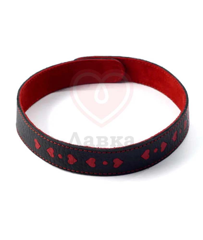 Изготовлен из натуральной кожи черного цвета с велюровой красной подкладой. Украшен оригинальной аппликацией в форме сердечек. Ширина чокера 20 мм. Размер универсальный и регулируется при помощи 4 металлических клелепок. Общая длина чокера в развернутом виде 40 см. Подходит для диаметра шеи от 10 до 13 см.