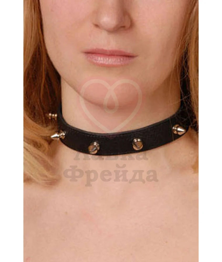 Узкий чёрный чокер изготовлен из натуральной кожи и украшен металлическими шипами. Ширина ошейника 20 мм, длина шипов 12 мм. Размер универсальный, регулируется при помощи кнопок. При изготовлении использована никелированная фурнитура.