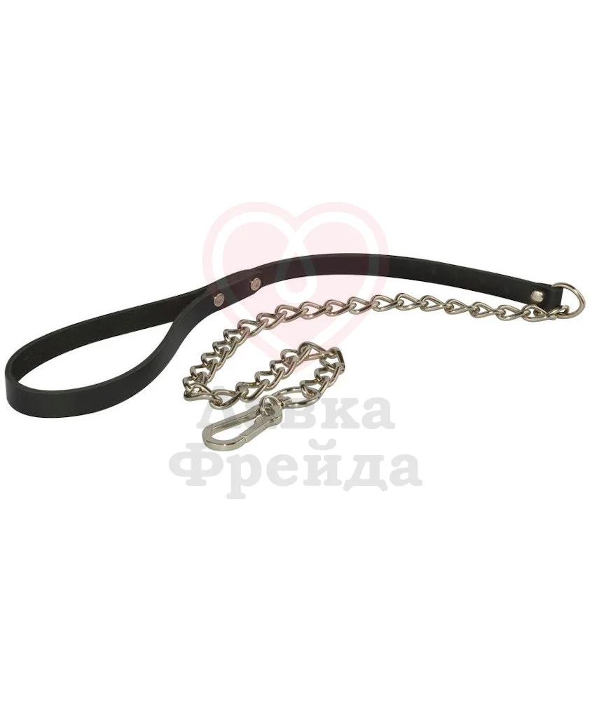 Поводок для ошейника из натуральной кожи с цепочкой из металла и длинным карабином. Его легко пристегнуть к любому ошейнику или чокеру с колечком. Тонкий кожаный ремешок придаст утонченности вашими аксессуарам, а металл добавит приятный звук звеньев, украшающий любую игру в тематике БДСМ.