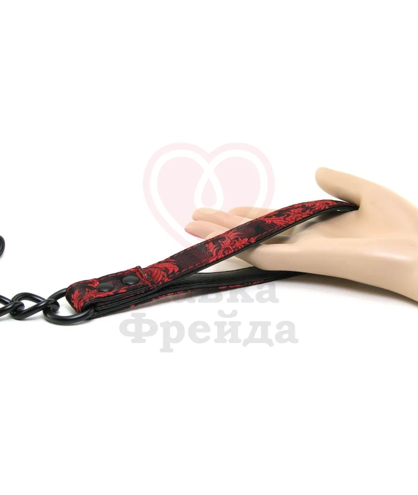 Чёрный поводок с металлической цепью – это изысканный и полезный аксессуар, который позволит вам ещё сильнее погрузиться в мир БДСМ-игр. Петля для руки из полиэстера украшена красным узором и чёрными пуговицами. Длина – 81 см. Вы можете использовать поводок с ошейником или оковами, карабин обеспечивает быструю и надёжную фиксацию.