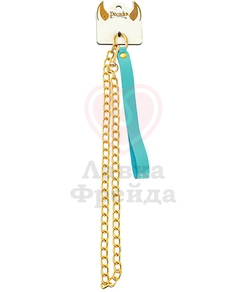Поводок Pecado BDSM будет прекрасным дополнением БДСМ атрибутики. Аксессуар состоит из прочной стальной цепи золотистого оттенка, дополненной карабином на конце, и кожаной петлей-рукояткой, которая удобно лежит в руке или крепится на запястье, не выскальзывая даже при интенсивном движении. К карабину можно прикрепить любой ошейник или другое изделие с кольцом, позволяя себе с головой окунуться в мир пикантных экспериментов. Ярко-голубая натуральная кожа поводка отличается мягкостью и устойчивостью к механическим повреждениям, а мягкая изнанка, при правильном использовании, не натирает даже самые нежные участки.