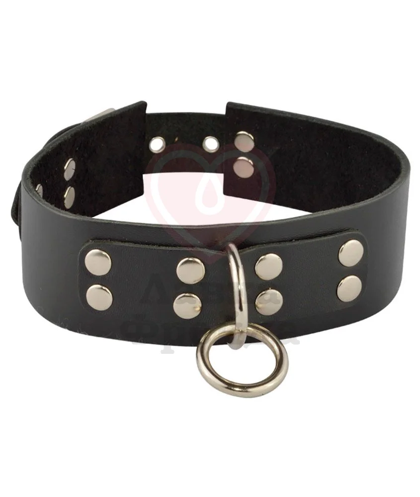 Широкий ошейник из натуральной кожи украшен дополнительными металлическими клепками для стильного вида. В центре к кожаной полоске закреплены два колечка для поводка. Размер аксессуара регулируется при помощи пряжки сзади.