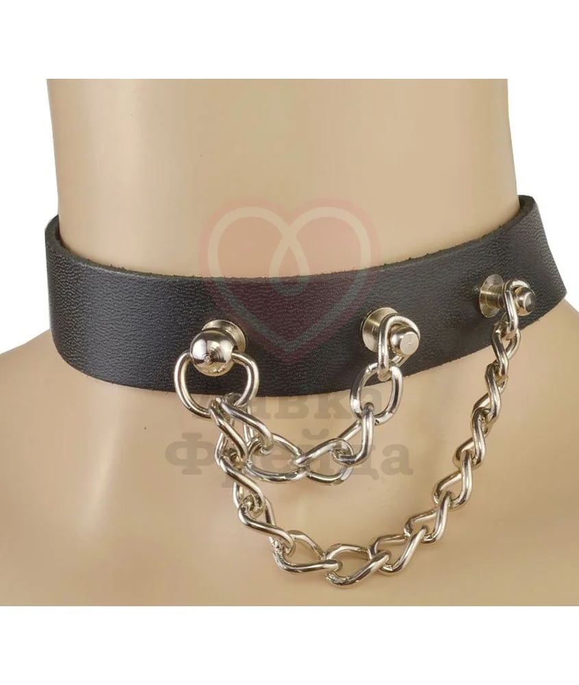 Тонкий чокер из натуральной кожи будет изящно смотреться, обхватывая шею. Модель украшена цепочками из металла в качестве дополнительной детали, которые закрепляются к центральному колечку. Аксессуар регулируется по размеру при помощи кнопок.