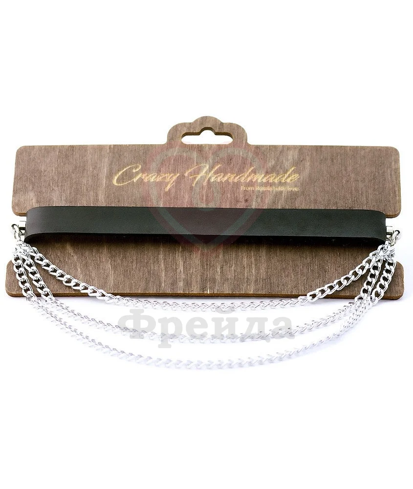 Чокер из узкой полоски кожи имеет по бокам крепления, где присоединены три изящные цепочки, спускающиеся параллельно ремешку. Сочетание кожи и металла выглядит очень дерзко и привлекательно. Ремешок регулируется при помощи 4 отверстий. Аксессуар предоставляется на фирменной деревянной планшетке с подвесом.