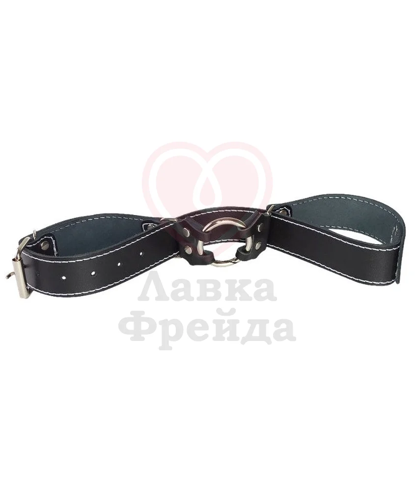 Кожаные оковы в виде одного ремешка с затягивающими петлями, выполнены из натуральной чёрной кожи и имеют белую контрастную строчку по краю. Регулируются при помощи пряжки. В центре расположено кольцо, которое можно использовать для дополнительных элементов и фиксации. Вся металлическая фурнитура имеет хромированное покрытие.