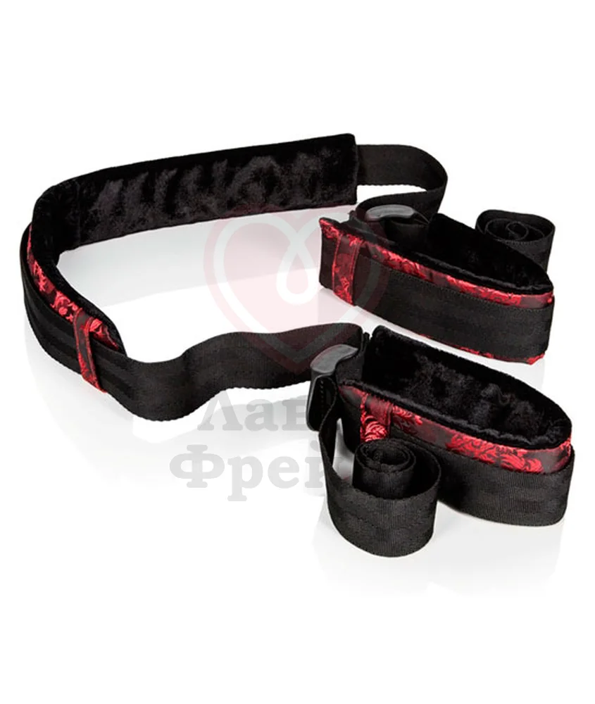 Наножники Scandal Love Sling выполнены из чёрного мягкого полиэстера и украшены красным дизайнерским рисунком. Длина регулируемых манжет – 45,7 см, диаметр – 5,7 см. Длина шейного ремня – 85-128 см. Атрибут используется для фиксации партнёра и воплощения любых эротических фантазий. Оковы надеваются на нижнюю часть бёдер, а ремень перебрасывается через шею. Материал безопасен для людей с нежной чувствительной кожей.