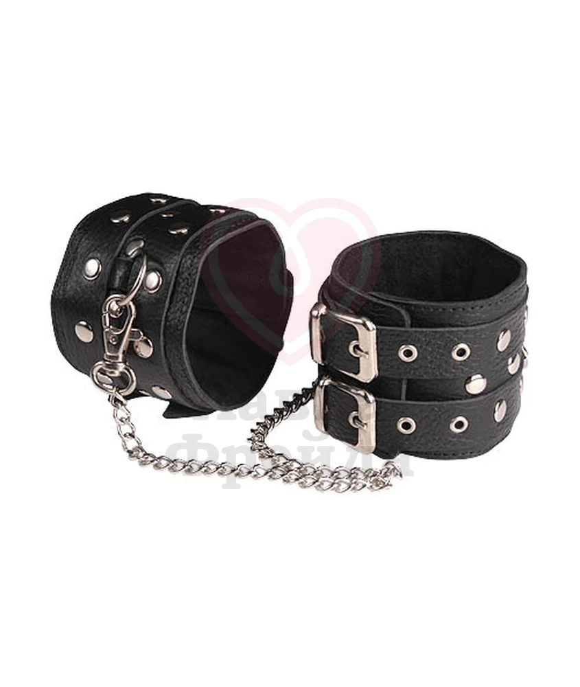 Оковы. Изготавливаются из натуральной кожи с велюровой подкладой. При изготовлении использована фурнитура с никелевым покрытием. Между слоем основы и подкладой проложена мягкая прокладка. Соединяются между собой цепочкой длиной 35 см с двумя карабинами на концах. Не нарушают кровообращение, надёжно фиксируются на щиколотках с помощью двух ремешков. Размер универсальный.
