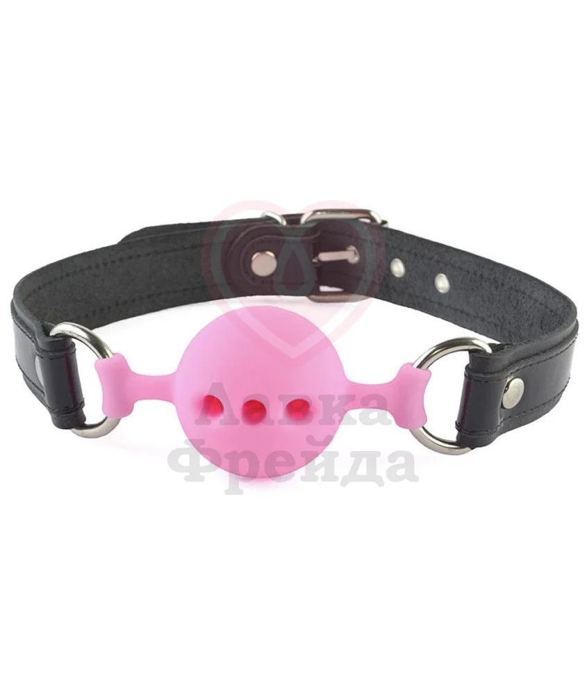 Кляп выполнен из нескольких материалов: розовый шарик с дырочками для дыхания сделан из медицинского силикона, чёрные ремешки для регулирования из натуральной кожи с вставкой из лакированной кожи, вся фурнитура — металлическая с никелевым покрытием. Кляп легко регулируется при помощи пряжки. Такой девайс следует всегда держать в чистоте и порядке — для этого лучше всего протирать шарик из силикона при помощи дезинфицирующего спрея или пенки.