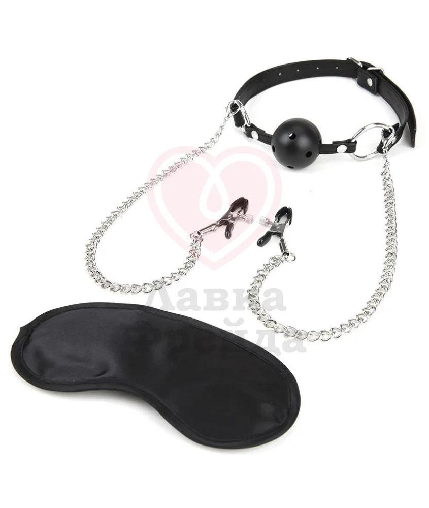 Кляп с шариком из ABS-пластика с дырочками для дыхания имеет регулирующий размер ремешок, а также два металлических колечка, к которым при помощи карабинов закрепляются цепочки с зажимами для сосков. В зависимости от настроения можно использовать зажимы или нет, а также регулировать силу их сжатия. А для повышения чувственного уровня ваших взаимодействий в комплект также входит тканевая маска на глаза.