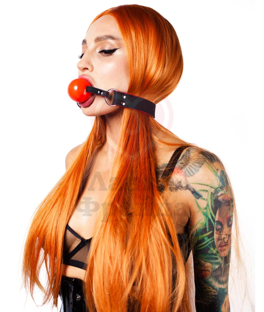 Ярко-красный кляп Scandal, имеющий форму шарика, выполнен из нежного медицинского силикона, не имеющего вкуса или запаха. Не имеет отверстий для дыхания. Фиксируется на голове с помощью тонких кожаных ремней, дополненных классическими пряжками, за счет чего можно регулировать обхват от 45 до 58 сантиметров. Чёрные ремни изготовлены из качественной натуральной кожи - прочный, устойчивый к износу материал, достаточно мягкий, чтобы не травмировать кожу лица и головы.