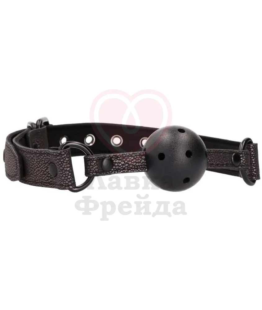 Ремешок этого кляпа выполнен из переработанной кожи и имеет необычный серый цвет. Внутрь ремешка также добавлен неопрен для более мягкого прикосновения и комфортного использования. Обхват кляпа регулируется при помощи классической пряжки от 40 до 56 см в обхвате головы. Прочный шарик диаметром 4,5 см имеет специальные отверстия для дыхания — это облегчит большинство взаимодействий, сохранив элемент фиксации.