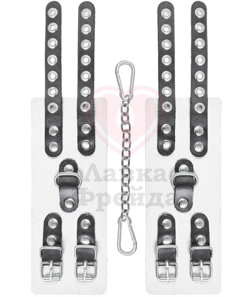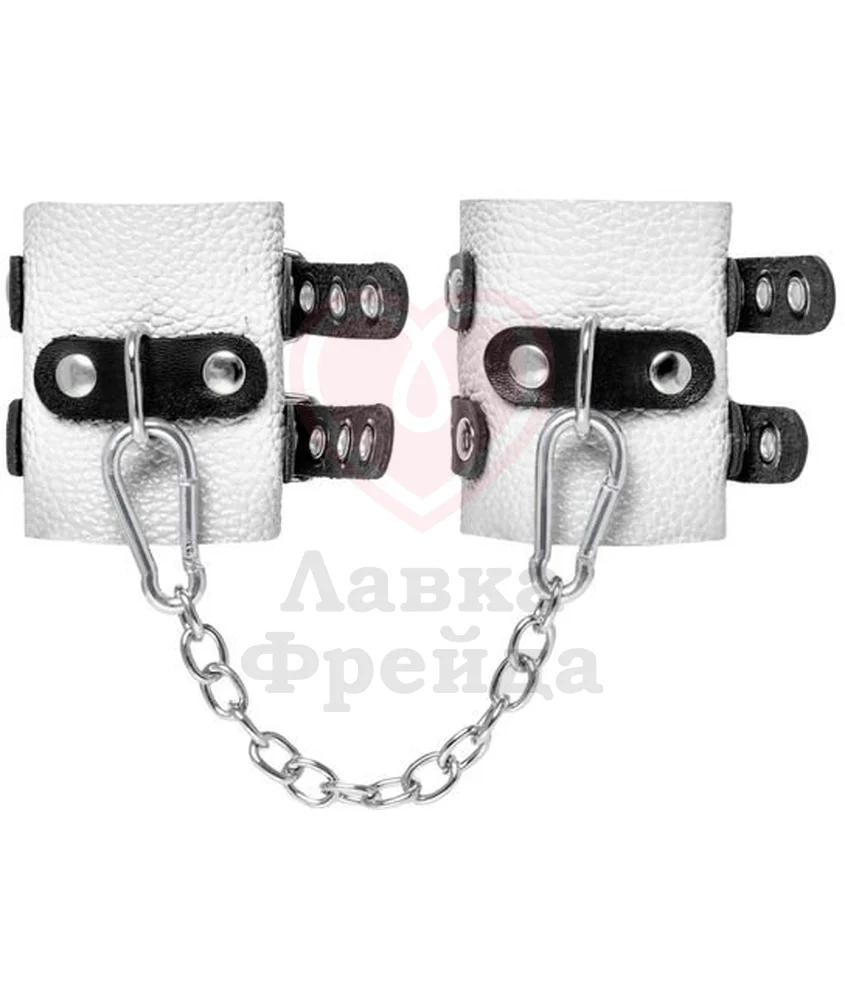 Классические наручники выполнены из одного слоя натуральной кожи белого цвета. Между собой соединяются металлической цепочкой с карабинами. Размер регулируется с помощью двух чёрных ремешков с пряжками, органично вписывающихся в общий стиль.
