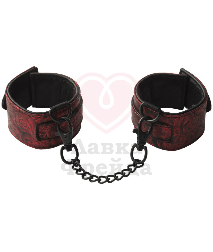 Наручники '50 оттенков серого' Sweet Anticipation выполнены из искусственной черной кожи и текстильной поверхностью с красными розами. Двухсторонний дизайн помогает использовать аксессуар той стороной, которая вам больше нравится. Длина одного наручника составляет 25,7 см, ширина 5,3 см.