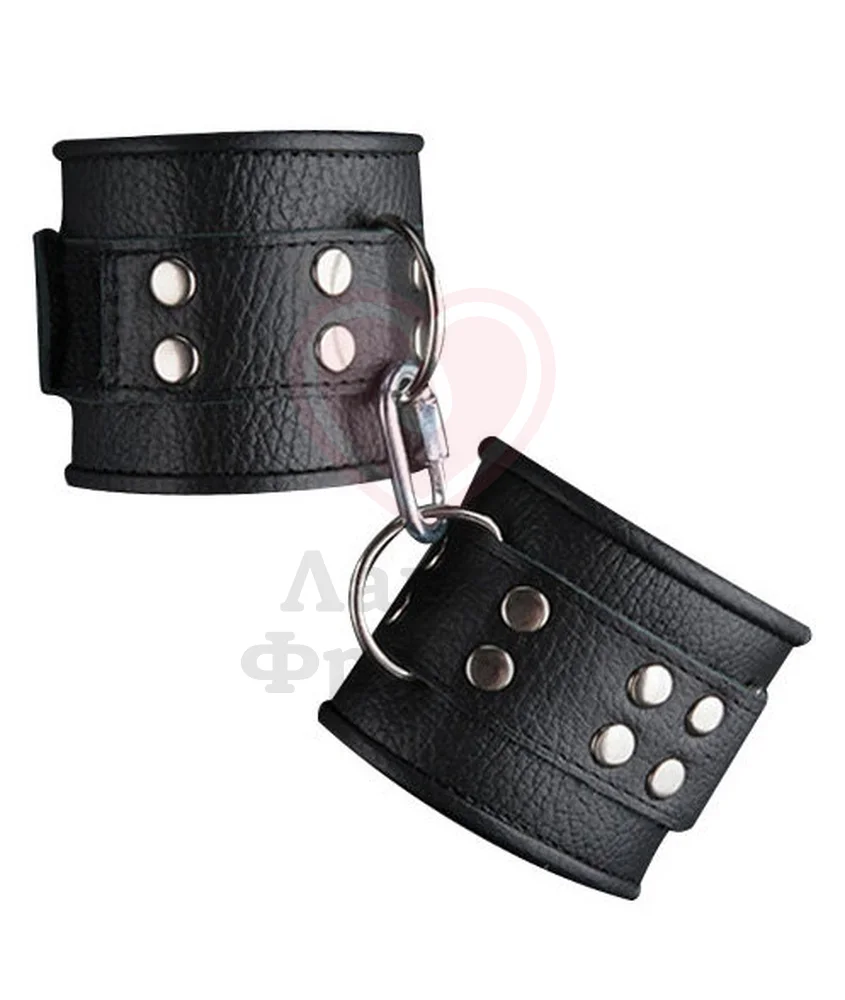 Наручники Sitabella выполнены из натуральной кожи черного цвета с мягкой внутренней подкладкой. Между собой соединены коротким металлическим карабином.
