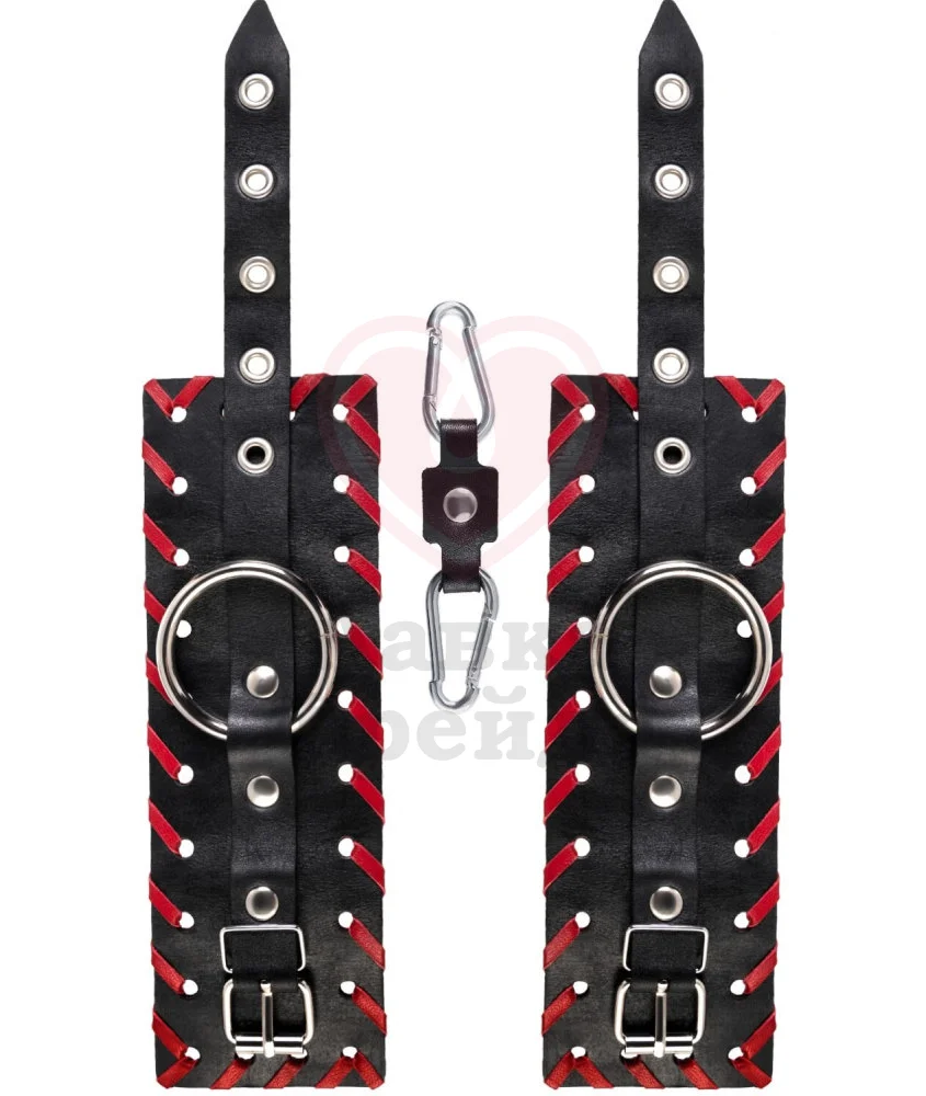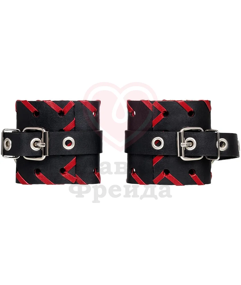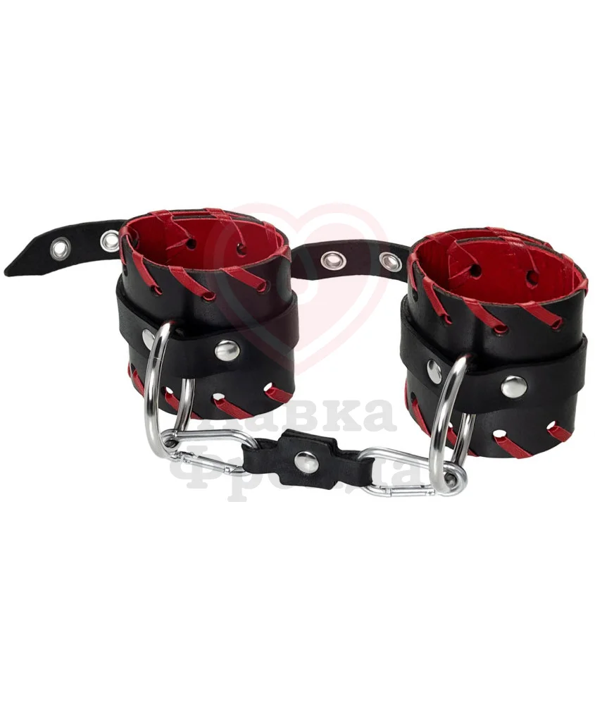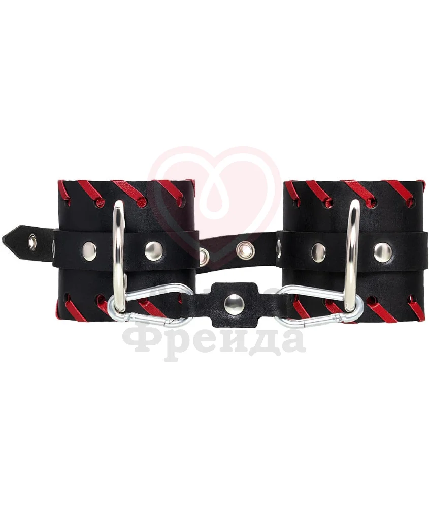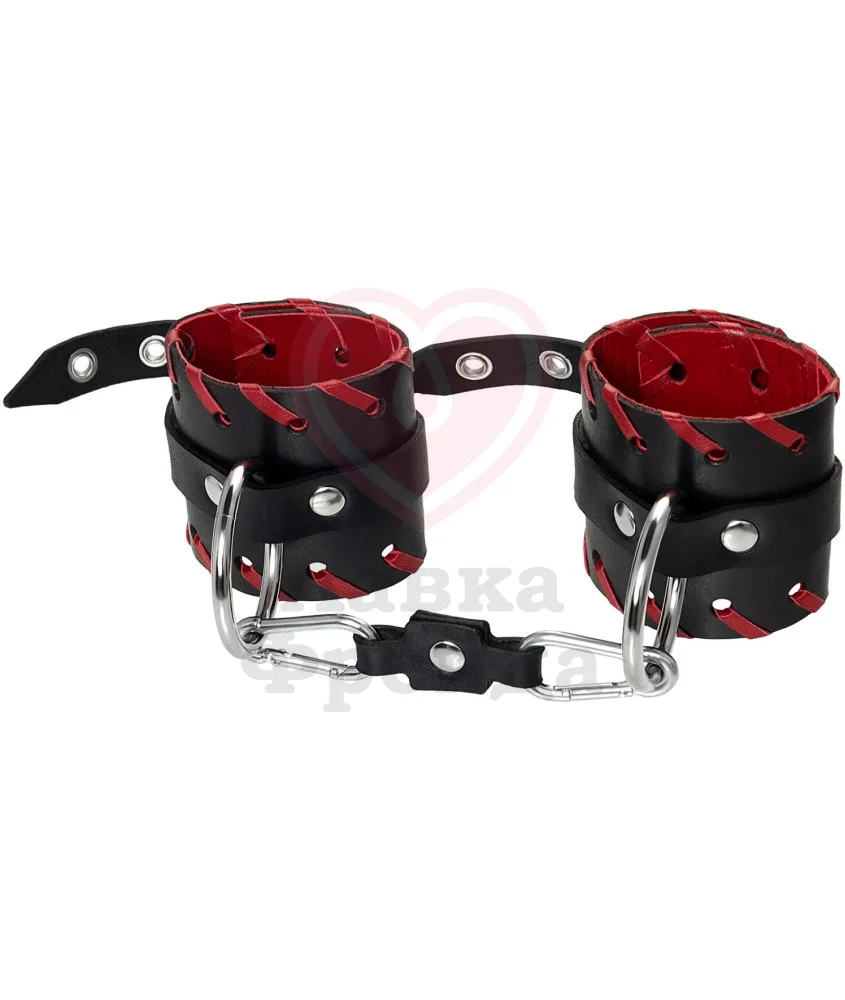 Аксессуар выполнен из двух слоев натуральной кожи - прочной и тактильно приятной, не доставляющей дискомфорта во время носки. За счет карабинов и цепи оковы можно разъединять, а удобные пряжки дают возможность регулировать размер наручников.