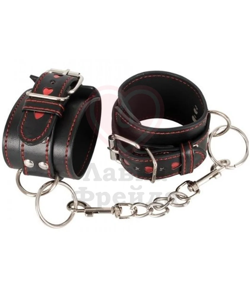 Изготовленные из эко-кожи, они не оставляют натертостей на запястьях, а размер легко регулируется с помощью ремешков. Цепочка с двумя карабинами представляет массу возможностей для реализации фантазий, легко соединяет их между собой или позволяет приковать нижнего к любому неподвижному предмету.
