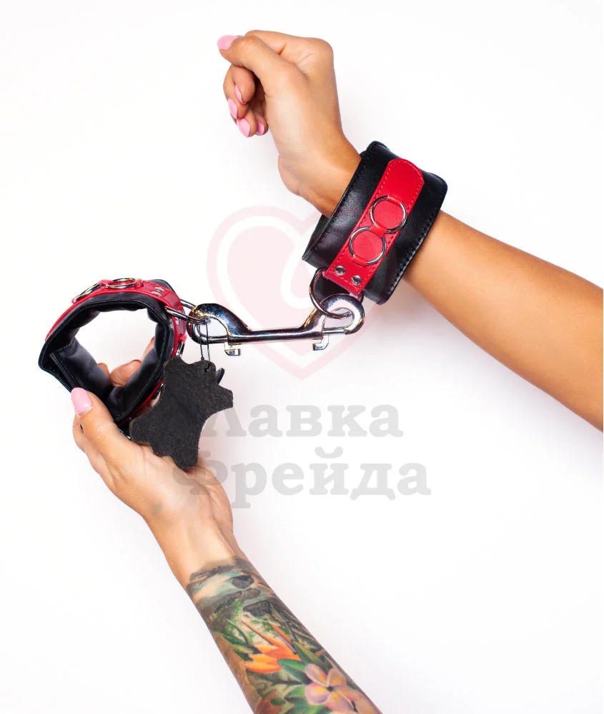Наручники Scandal - отличное дополнение ролевых игр и БДСМ сценариев, включающих в себя ограничение подвижности партнера. Чёрно-красный аксессуар выполнен из приятной на ощупь, устойчивой к износу натуральной кожи, достаточно мягкой, чтобы не травмировать запястья. Между собой браслеты соединены цепью из нержавеющего металла. Цепочка крепится к наручникам с помощью карабинов. Сами браслеты украшены металлическими кольцами - оригинальное дизайнерское решение. Размер можно регулировать удобными застежками.