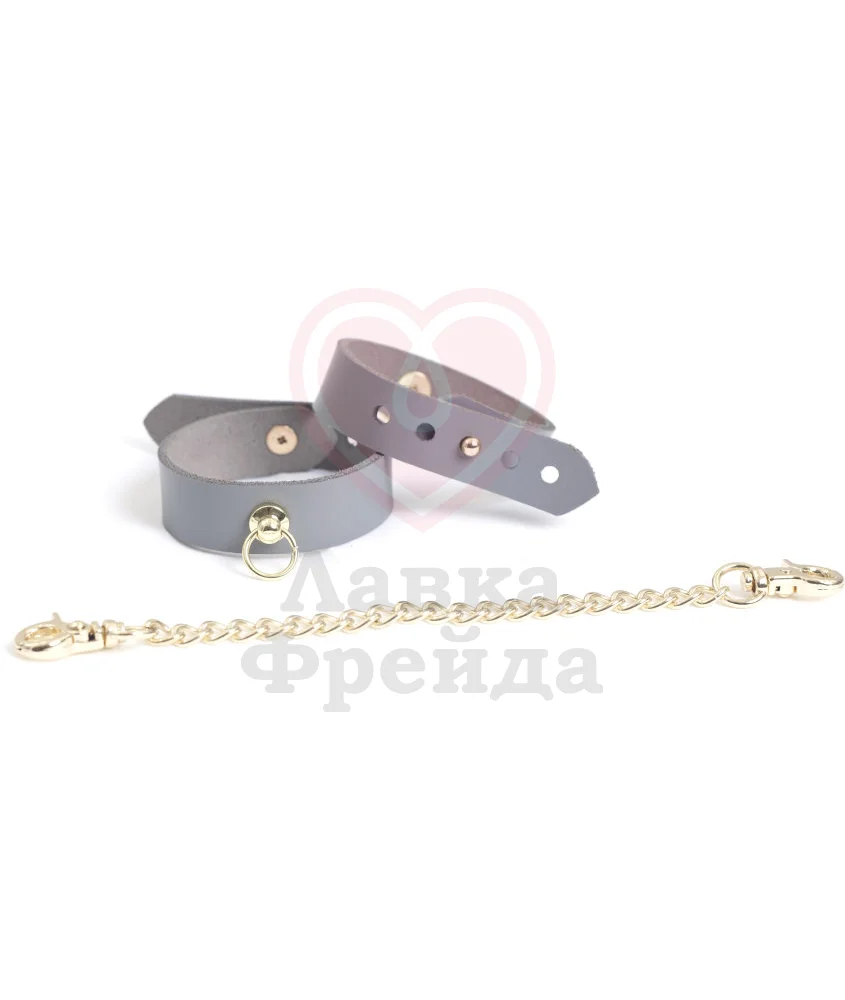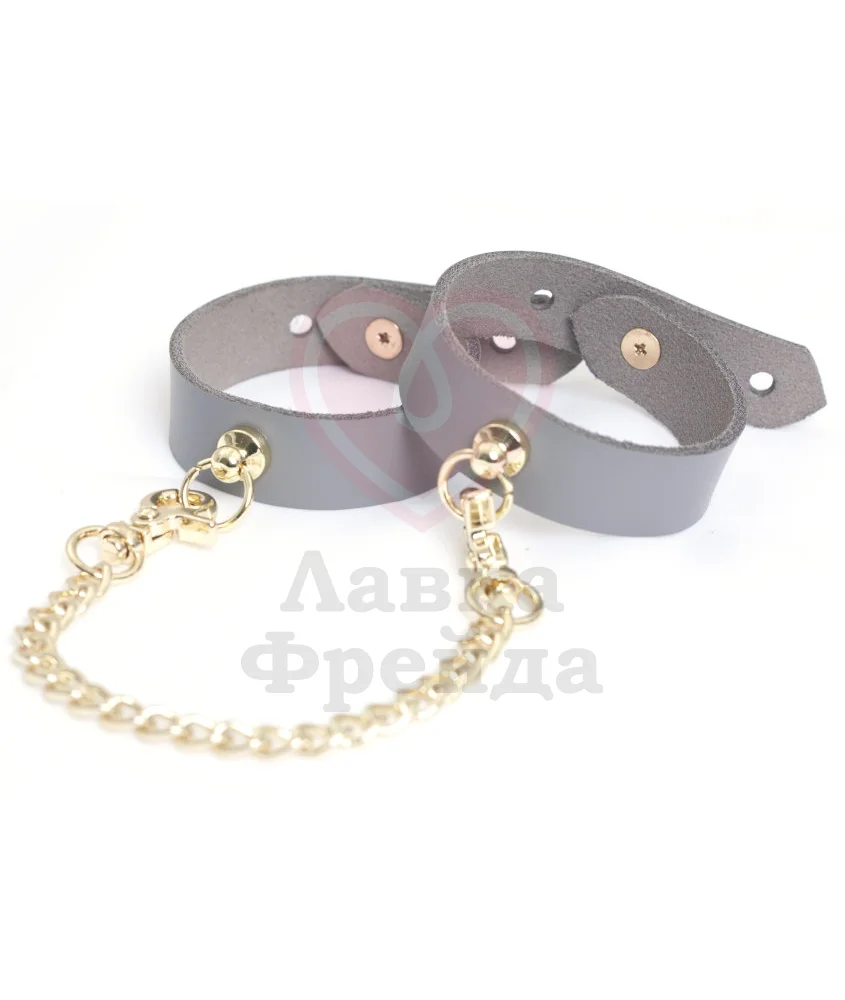 Изящные наручники Лунный Свет выполнены из натуральной кожи серого цвета. Между собой наручники соединяются небольшой золотистой цепочкой длиной около 10 см. Обхват регулируется при помощи ремешков с пряжкой и подойдет для размера запястья от 15 до 25 см.
