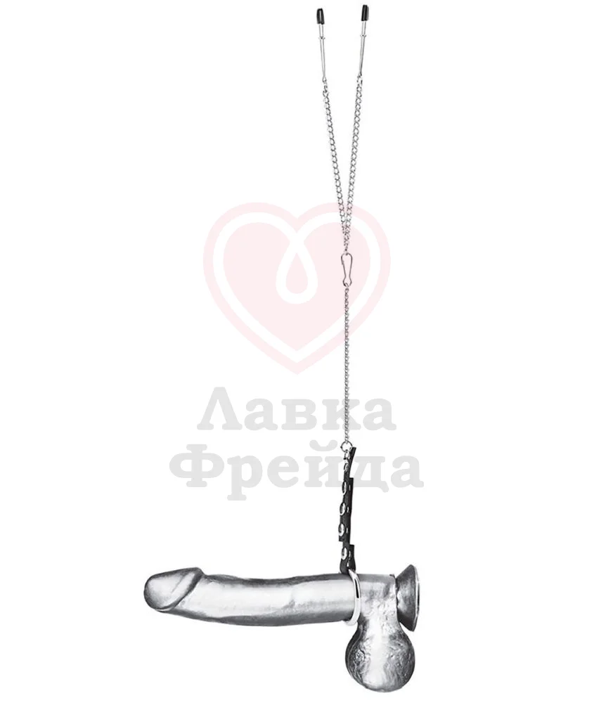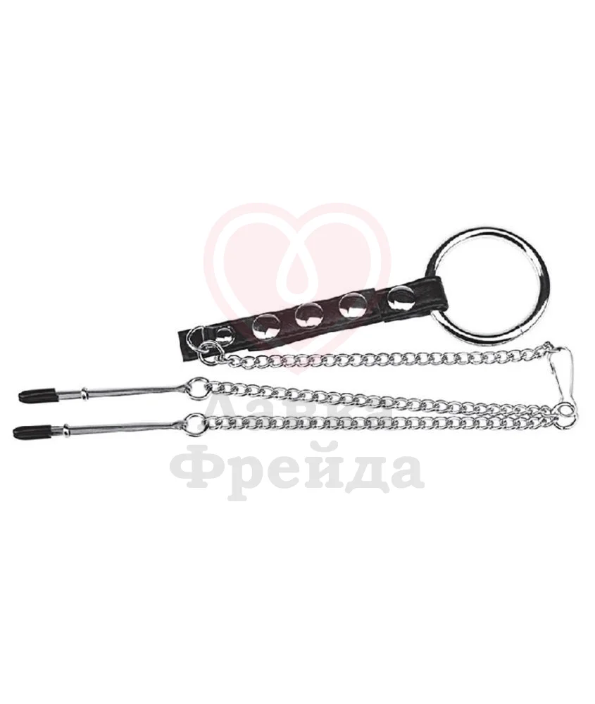 Кольцо Cock Ring with Nipple Tweezers надевается не только на член, ведь в комплекте идут длинные цепочки, фиксирующиеся на сосках. В тандеме они создают новые ощущения, ранее не возникающие ни от одного другого аксессуара. Металлическое кольцо, соединенное с сосками, стимулирует эрекцию и позволяет управлять партнером так, как вам захочется.