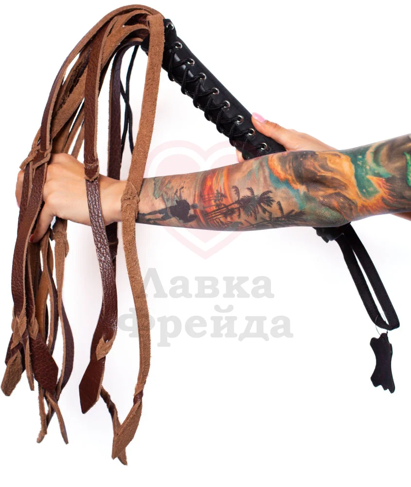 Большая плётка Scandal имеет плотную рукоять с дизайнерским плетением, дополненную удобной петлей-ручкой, которая обеспечивает надежную фиксацию флоггера на запястье. Длинный хвост плести сделан в виде узких кожаных лент, также украшенных необычным плетением в центре и на концах. Рукоять чёрного цвета, хвост - коричневый. Изготовлено из натуральной кожи премиального качества - прочной, износостойкой, но достаточно мягкой, чтобы не травмировать тело.