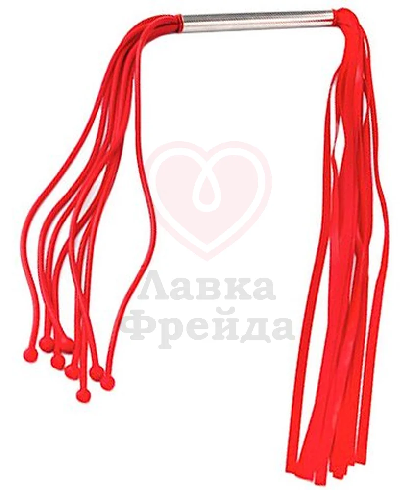 Плеть двухсторонняя изготовлена из натурального гипоаллергенного латекса, имеет 8-9 хвостов длиной 35-40 см. С одной стороны кончики хвостов усилены шариками для увеличения ударного эффекта, а с другой хвосты ленточные - более мягкий удар. Ручка металлическая, хромированная, длина 14 см, диаметром 1,6 см.